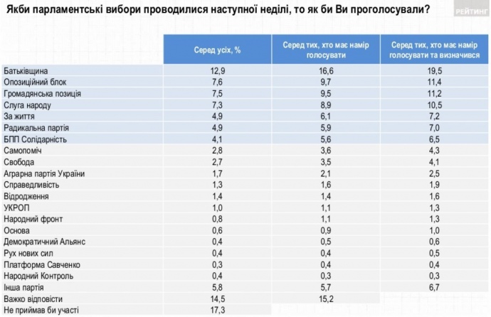 Батькивщина и Оппозиционный блок лидируют в рейтинге партий