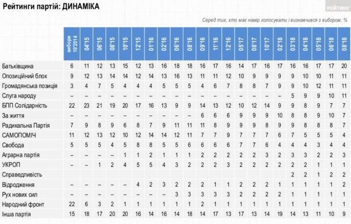 Партийный рейтинг возглавляет "Батькивщина", которую готовы поддержать 19,5% тех, кто планирует голосовать и определился с выбором. На второй позиции "Оппозиционный блок". "Гражданская позиция" Анатолия Гриценко и гипотетическая партия "Слуга народа" Владимира Зеленого на третьем и четвертом местах.