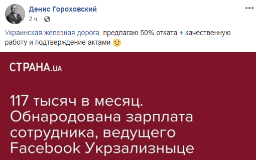Политический эксперт и блогер Денис Гороховский предложил Украинской железной дороге 50% отката + качественную работу и подтверждение актами.
