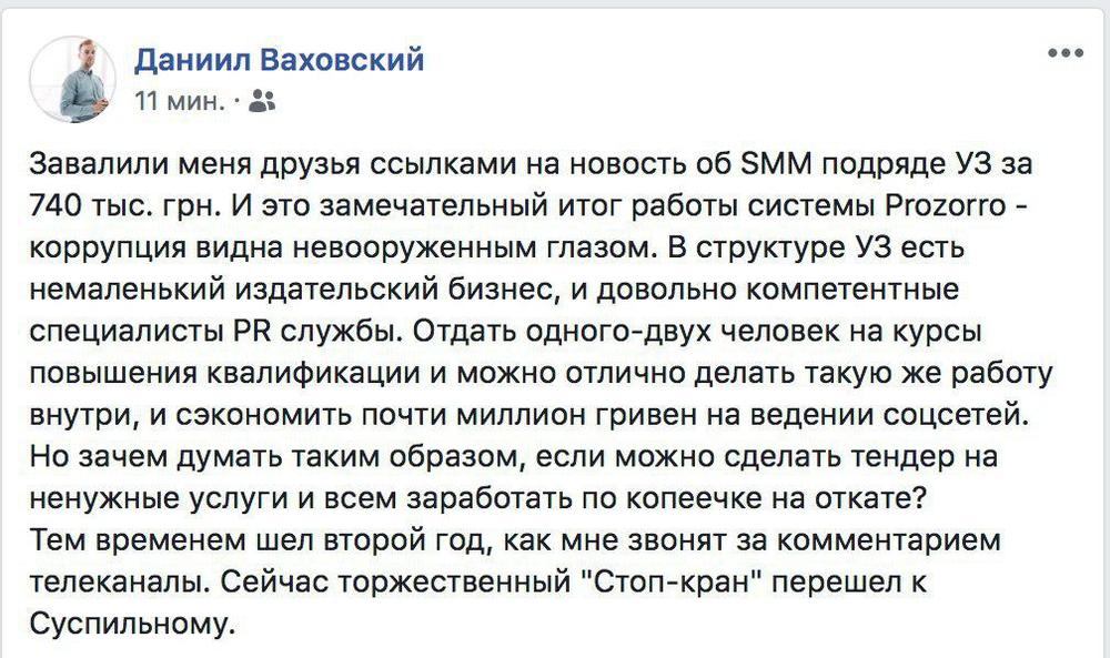 Директор по маркетингу сервиса Uklon Даниил Ваховский отмечает, что благодаря Prozorro коррупция видна невооруженным глазом. Он отмечает, что в системе УЗ есть немаленький издательский бизнес, специалисты PR и нескольких специалистов можно было бы обучить, чтобы они отлично вели такую же работу, тем самым сэкономив почти миллион гривен на ведении соцсетей.