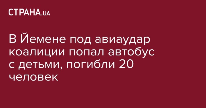 Арабская коалиция во главе с Саудовской Аравией нанесла авиаудар по Йемену, в результате которого был уничтожен автобус, в котором находились дети. В итоге по меньшей мере 20 человек погибли, еще 35 были ранены. Об этом сообщает Associated Press.