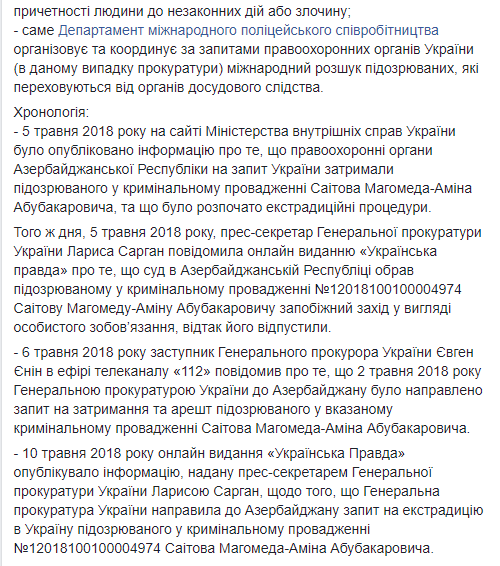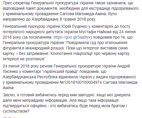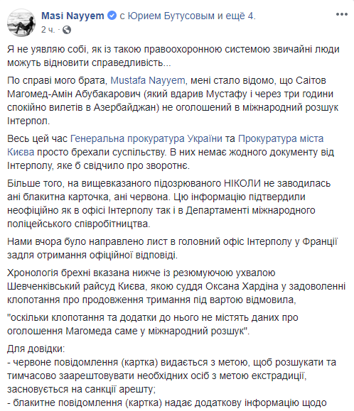 "Мне стало известно, что Саитов Магомед-Амин Абубакарович (который ударил Мустафу и через 3 часа спокойно вылетел в Азербайджан) не объявлен в международный розыск Interpol. Все это время Генеральная прокуратура Украины и Прокуратура города Киева просто лгали обществу. У них нет ни одного документа от Интерпола, который бы свидетельствовал об обратном", - написал Маси Найем.