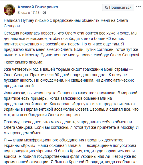 Народный депутат от Блока Петра Порошенко и член украинской делегации в Парламентской ассамблее Совета Европы Алексей Гончаренко написал письмо президенту России Владимиру Путину, в котором предложил обменять его на украинского режиссера Олега Сенцова, находящегося в российской колонии.