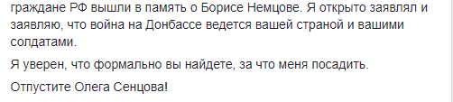 "Мы делаем все возможное, чтобы освободить Сенцова и более 60 наших политзаключенных из российских тюрем. Но они все еще там. Я предлагаю взять меня вместо Олега. Если Путин согласен, готов тут же вылететь в Москву. Единственное мое условие: свободу Олегу Сенцову!" – заявил он.