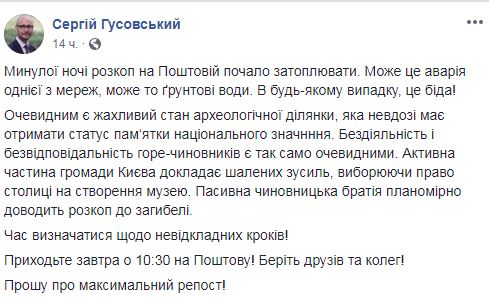 В Киеве, на Почтовой площади погибают от воды древние строения и улицы времен Киевской Руси, найденные археологами и где прекращено строение ТРЦ. Об этом сообщил на своей странице в Facebook депутат Киеврады Сергей Гусовский.