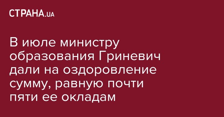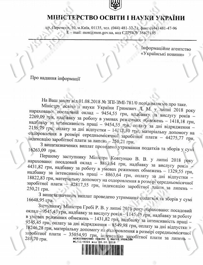 Заработная плата министра образования и науки Лилии Гриневич за июль составила 83,4 тыс. гривен, ее заместителей - от 36,1 тыс. до 85,4 тыс. гривен, государственного секретаря министерства - 78,6 тыс. гривен. Об этом говорится в ответе Министерства образования и науки на запрос, пишут Украинские новости.