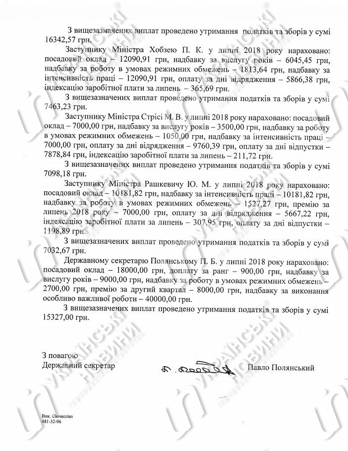 Зарплата первого заместителя министра Владимира Ковтунца за июль составила 85,4 тыс. гривен, заместителей Романа Гребы - 83,8 тыс. гривен, Павла Хобзея - 38,3 тыс. гривен, Максима Стрихи - 36,4 тыс. гривен, Юрия Рашкевича - 36,1 тыс. гривен и госсекретаря Павла Полянского - 78,6 тыс. гривен.