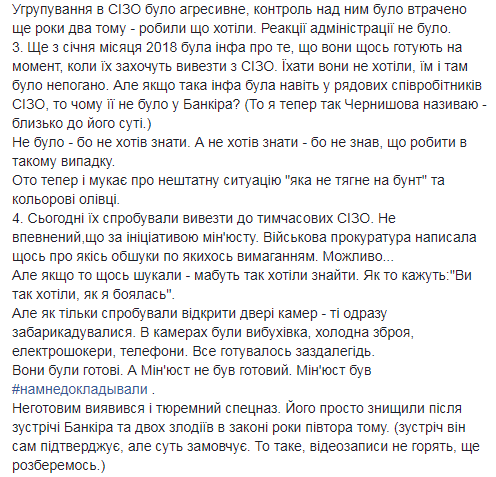 "Еще с января 2018 была инфа о том, что они что-то готовят на момент, когда их захотят вывезти из СИЗО. Ехать они не хотели, им и там было неплохо. Но если такая инфа была даже у рядовых сотрудников СИЗО, то почему ее не было в Банкира? (Это я теперь так Чернышева называю - близко к его сути. (заместитель министра юстиции Денис Чернышев - Прим.Ред.). Не было - потому что не хотел знать. А не хотел знать - не зная, что делать в таком случае.