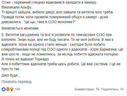 Детали произошедшего он написал в Facebook. Адвокат сообщил, что заключенные "давно земли под собой не чувствовали - передвигались по СИЗО без помех, чудили что хотели, пользование мобильной связью и интернетом не вызывало вопросов даже у руководителей Минюста и журналистов".