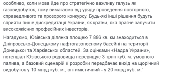 Как сообщалось, в июле 2016 года нидерландская Yuzgas стала победителем конкурса по привлечению инвестора для реализации СРП по добыче углеводородов в пределах Юзовской площади, однако Кабинет министров 2 ноября того же года протокольным решением отказал ей в участии в СРП.