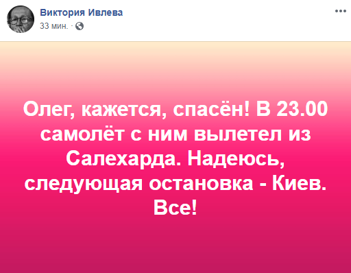 "Олег, кажется, спасен! В 23:00 самолет с ним вылетел из Салехарда. Надеюсь, следующая остановка - Киев. Все!", - написала она.