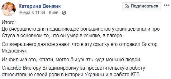 "Медведчук продолжает свою войну против Стуса. Сейчас он демонстрирует силу: говорят, пытается переписать сценарий кино об убитом поэте. Но невозможно переписать историю, в которой его жертва останется национальным гением и символом достоинства, а сам он – коллаборантом и политиком-неудачником", – пишет в соцсети глава Института национальной памяти Владимир Вятрович.