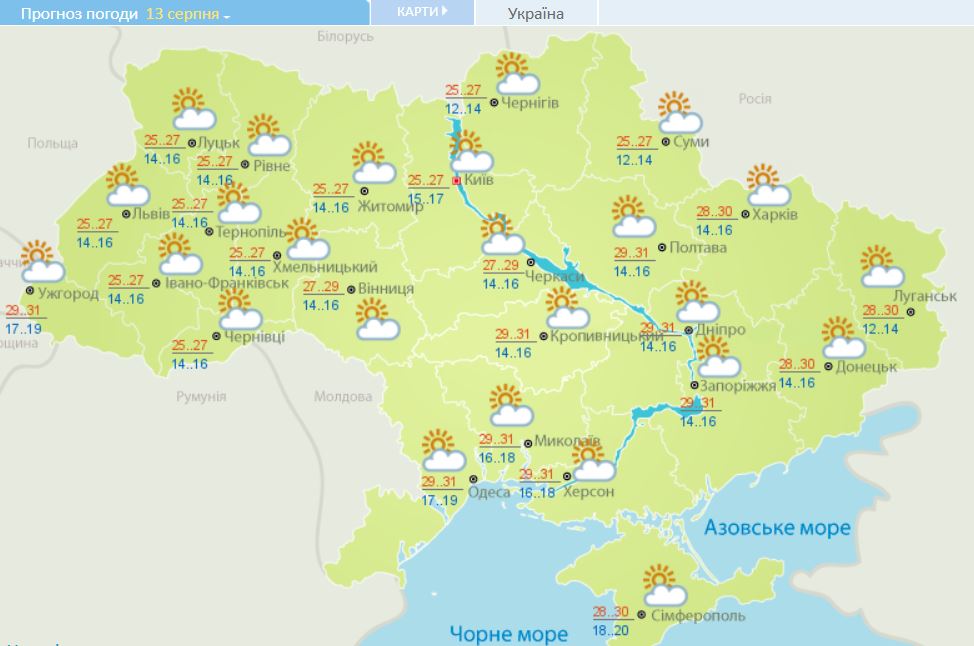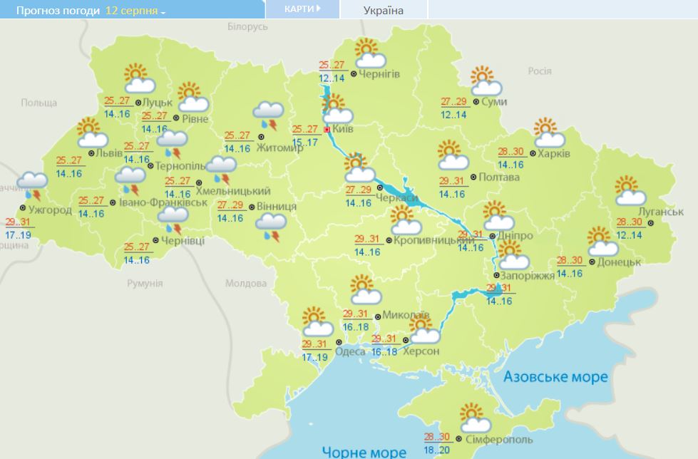 Так, в воскресенье, 12 августа, дождей и гроз следует ожидать в Житомирской, Винницкой, Хмельницкой, Черновицкой, Тернопольской, Ивано-Франковской, Закарпатской областях. На западе страны днем в среднем от 25 до 27 градусов, на севере – от 25 до 29, в центральных областях от 27 до 31 градуса, в восточных – от 28 до 30 градусов, и на юге от 29 до 31 градуса тепла.