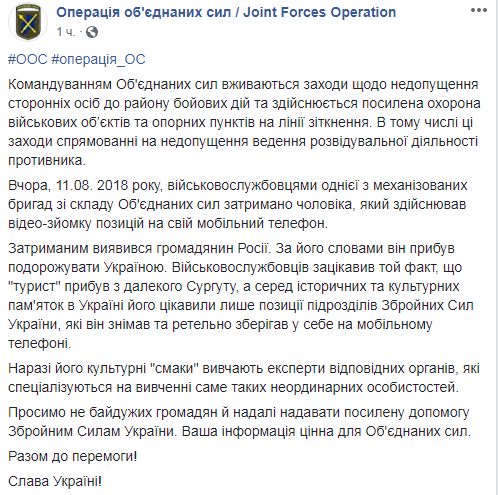 11 августа в зоне ООС задержали гражданина РФ, который фиксировал позиции украинских военных на свой мобильный телефон. Об этом командование Объединенных сил сообщает на странице в Facebook.