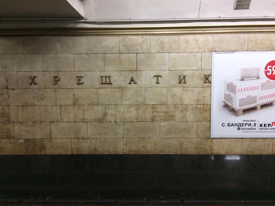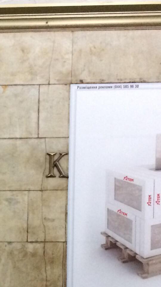 Блогер Илья Варламов разместил фото рекламного баннера на станции метро "Крещатик" в Киеве. Он обратил внимание, что реклама вплотную примыкает к букве К в названии станции.