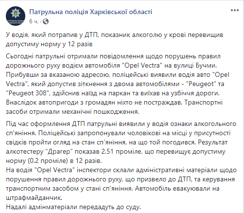 "Сегодня патрульные получили сообщения о нарушениях правил дорожного движения водителем автомобиля Opel Vectra на улице Бучмы. Прибыв по указанному адресу, полицейские обнаружили водителя авто Opel Vectra, который столкнулся с двумя автомобилями - Peugeot и Peugeot 308, - совершил наезд на забор и выехал на обочину дороги. В результате ДТП из граждан никто не пострадал. Транспортные средства получили механические повреждения", - говорится в сообщении.