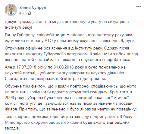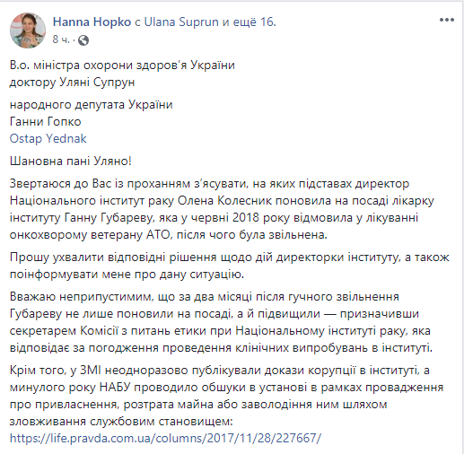 В своем обращении Гопко попросила выяснить основания для восстановления в должности врача Губаревой, "которая в июне 2018 отказала в лечении онкобольного ветерана АТО, после чего была уволена".