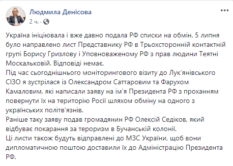 "Украина инициировала и уже давно подала РФ списки на обмен. 5 июля было направлено письмо представителю РФ в Трехсторонней контактной группе Борису Грызлову и уполномоченному РФ по правам человека Татьяне Москальковой. Ответа нет", - добавила украинский омбудсмен.