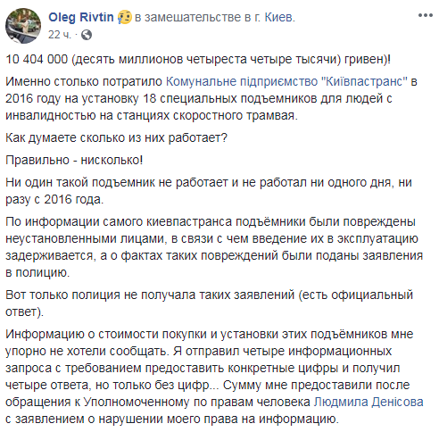 "Киевпастранс" не сообщал потраченную на установку подъемников сумму даже после четырех информационных запросов. "Сумму мне предоставили после обращения к Уполномоченному по правам человека Людмиле Денисовой с заявлением о нарушении моего права на информацию", - отметил Ривтин.