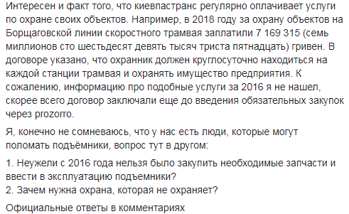 Также отмечается, что "Киевпастранс" регулярно оплачивает услуги по охране своих объектов. "Например, в 2018 году за охрану объектов на Борщаговской линии скоростного трамвая заплатили 7,1 млн грн. "В договоре указано, что охранник должен круглосуточно находиться на каждой станции трамвая и охранять имущество предприятия. К сожалению, информацию про подобные услуги за 2016 я не нашел", - уточняет Ривтин.
