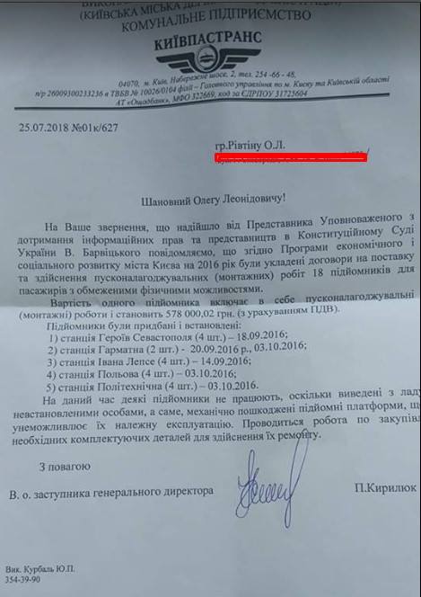Информацию о потраченной сумме и состоянии подъемников предоставил сам "Киевпастранс" в ответ на официальный запрос жителя Киева Олега Ривтина. Об этом киевлянин написал в Facebook.