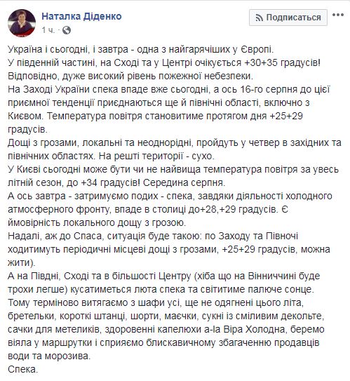 Она пишет, что не только в столице, но и по всей Украине  ожидается очень жаркая погода, в южной части, на Востоке и в Центре +30...+35 градусов. "Поэтому срочно вытаскиваем из шкафа все, еще не надето этим летом, бретельки, короткие штанишки, шорты, маечки, платья со смелым декольте, сачки для бабочек, здоровенные шляпы a-ля Вера Холодная, берем веера в маршрутки и способствуем молниеносному обогащению продавцов воды и мороженого", - советует Диденко.