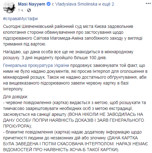 "Вчера состоялось заседание Шевченковского районного суда города Киева по рассмотрению ходатайства стороны защиты об изменении меры пресечения подозреваемому Саитову Ахмеду (водителю автомобиля Mercedes – человеку, спровоцировавшему инцидент - Прим.Ред.)", – написал Маси Найем.