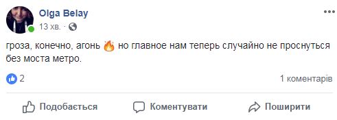 Около 3:00 в ночь с 15 на 16 августа на Киев обрушились дожди, град и мощнейшие грозы. Небывалые масштабы стихии оторвали среди ночи от уютных кроватей огромное количество жителей города, принявшихся закрывать окна и спасать сушившееся белье.
