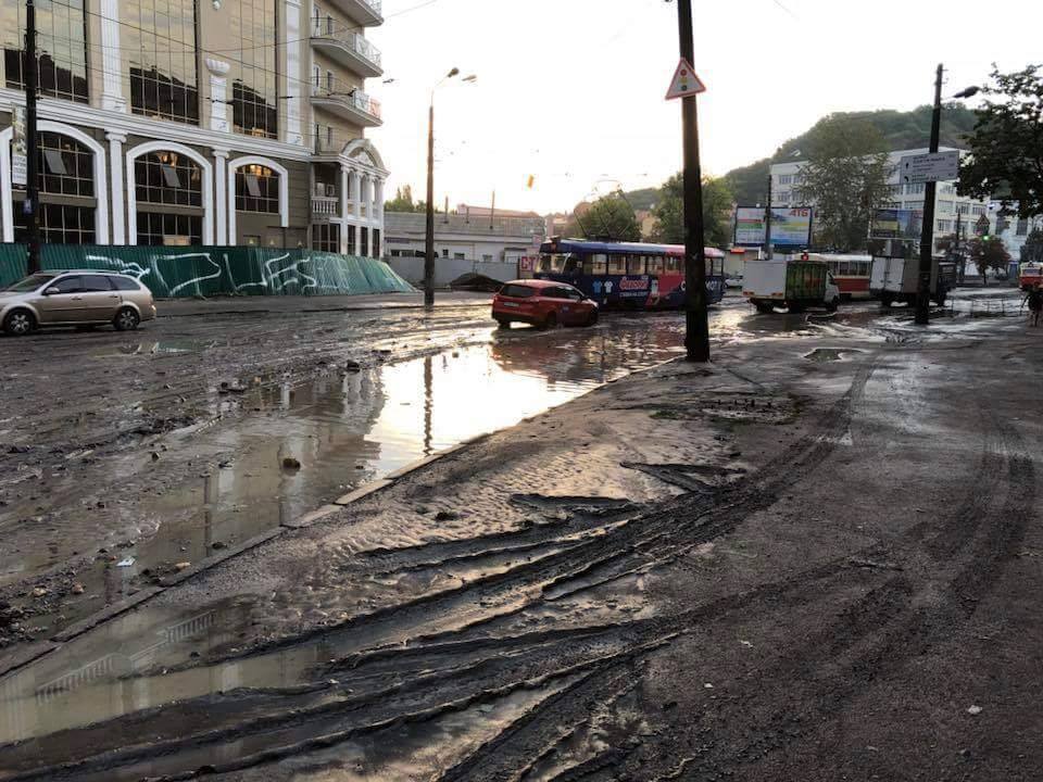 Утром машинам и пешеходам на Подоле пришлось пробираться по потокам грязи, которую принесла дождевая вода.