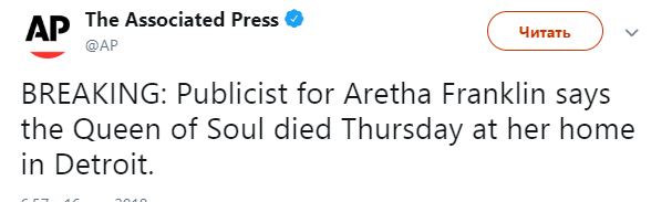 В США в возрасте 76 лет умерла певица Арета Франклин. Ее называли королевой соула. Она стала первой женщиной, чье имя было занесено в Зал славы рок-н-ролла. Журнал Rolling Stone объявил ее величайшей певицей в истории. Арета Франклин была удостоена 18 наград Grammy.
