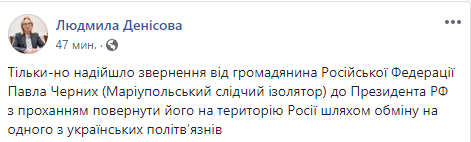 "Только что поступило обращение от гражданина Российской Федерации Павла Черных (Мариупольский следственный изолятор) к президенту РФ с просьбой вернуть его на территорию России путем обмена на одного из украинских политзаключенных", - написала Денисова в четверг в своей странице в соцсети Faceboook.