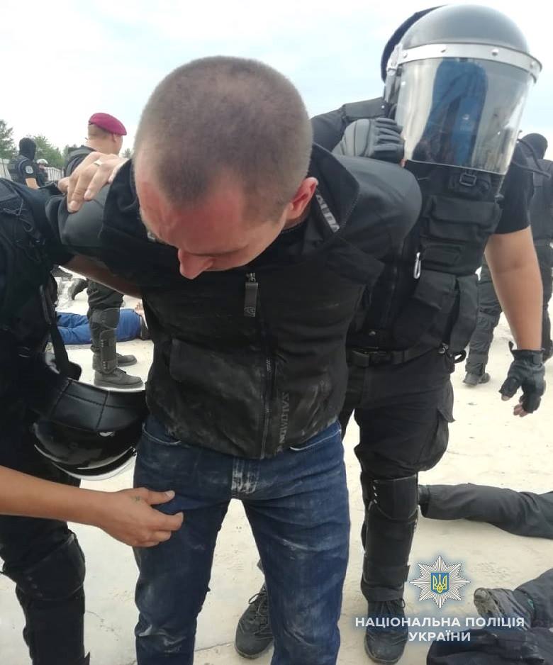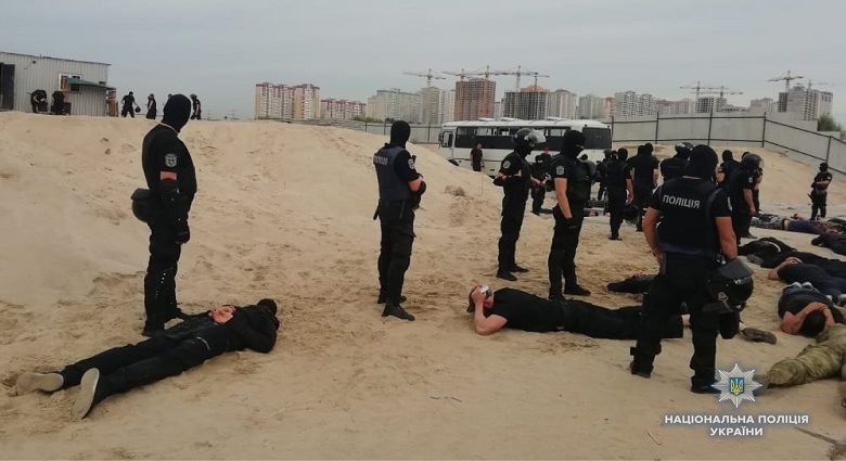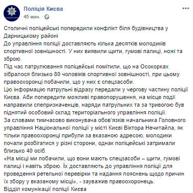 В сообщении говорится, что во время патрулирования полицейские заметили, что на Осокорках собралось около 80 мужчин спортивной внешности с щитами, резиновыми палками, ножами и оружием.