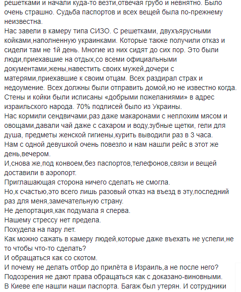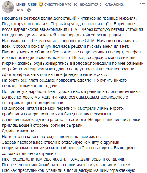 По прилету в Израиль также ей устроили допрос, продержав 4 часа без еды и воды.