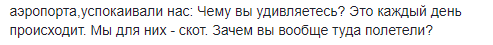"В Киеве еле нашли наши паспорта. Багаж был утерян. И сотрудники аэропорта,успокаивали нас: Чему вы удивляетесь? Это каждый день происходит. Мы для них - скот. Зачем вы вообще туда полетели?" - подытожила украинка.
