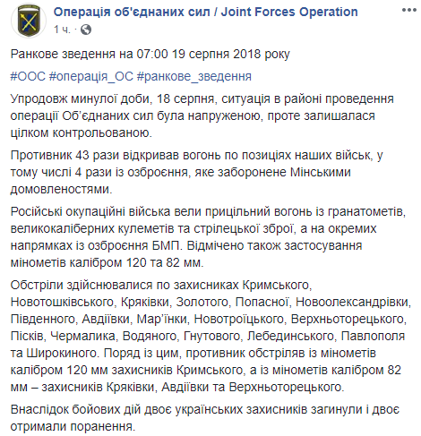За минувшие сутки боевики на Донбассе 43 раза нарушали Минские соглашения, применяя запрещенное вооружение. Об этом в Facebook сообщает пресс-центр ООС.