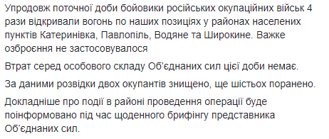 Обстрелы осуществлялись по защитникам Крымского, Новотошковского, Кряковки, Золотого, Попасной, Новоалександровки, Южного, Авдеевки, Марьинки, Новотроицкого, Верхнеторецкого, Песков, Чермалыак, Водяного, Гнутового, Лебединского, Павлополя и Широкиного.