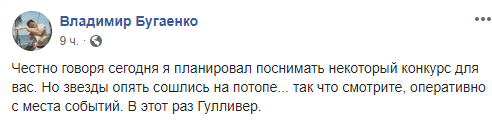 "Честно говоря, я планировал поснимать некоторый конкурс для вас. Но звезды опять сошлись на потопе... Так что смотрите, оперативно с места событий. В этот раз Гулливер", - рассказал Бугаенко.