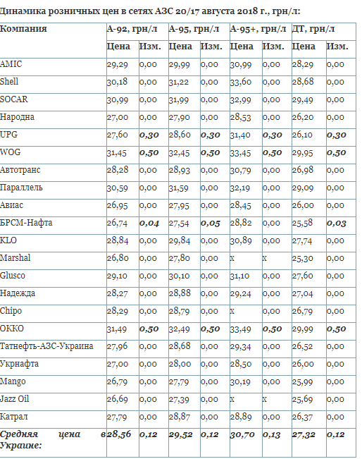 В период с 17 по 20 августа цены бензина и дизтоплива в сетях АЗС ОККО и WOG выросли на 50 коп./л. Об этом свидетельствуют данные мониторинга розничного рынка "Консалтинговой группы А-95", пишет Еnkorr.