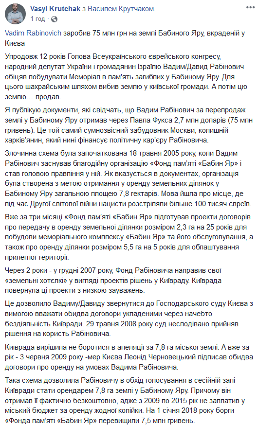 "В течение 12 лет председатель Всеукраинского еврейского конгресса, народный депутат Украины и гражданин Израиля Вадим/Давид Рабинович обещал построить Мемориал в память о погибших в Бабьем Яру. Для этого он выбил землю у киевской общины. А потом эту землю... продал.