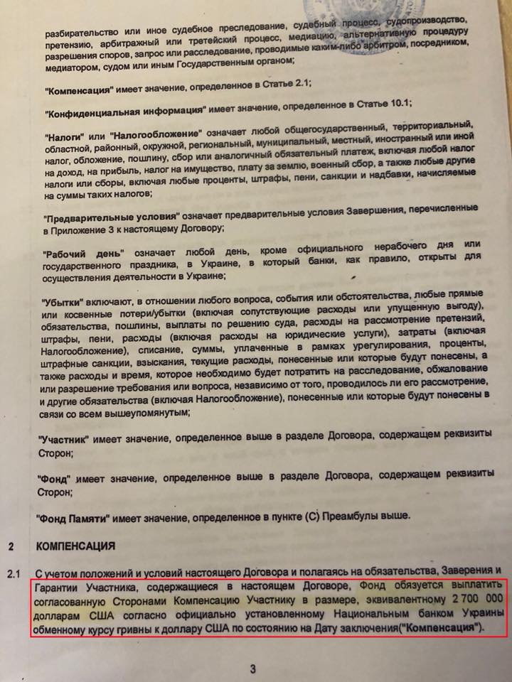 19 октября 2017 состоялось подписание "договора о компенсации" между Фуксом и генеральным директором "Мемориала Холокоста" Бабий Яр", известным польским политиком Мареком Сивецем. Согласно договору, на счета Павла Фукса, для него и его партнеров, должны быть переведены 2 700 000 долларов в гривневом эквиваленте (сейчас примерно 75 млн гривен). В тот же день Фукс обязался выйти из "Фонда памяти" Бабий Яр", а его партнеры (с Рабиновичем включительно) - написать нотариально заверенные заявления об отсутствии каких-либо претензий.