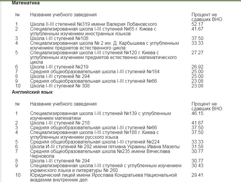 При составлении рейтинга учитывался не только процент участников, не сдавших ВНО, но и количество школьников, сдававших тесты в каждой школе. Все же есть разница, когда не сдали ВНО 5 учеников из 25, или 20 из 50. Также при равном проценте не сдавших, выше по списку оказалась школа, в которой указанный тест сдавали больше учеников. В антирейтинг включены только школы – ПТУ, техникумы, колледжи в расчет не брались.
