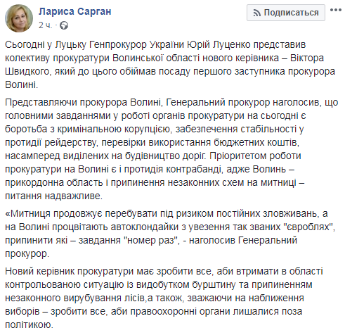 Генпрокурор Юрий Луценко представил коллективу прокуратуры Волынской области нового руководителя - Виктора Швыдкого. Приоритетом работы прокуратуры приграничной Волыни глава ГПУ назвал противодействие контрабанде и прекращение незаконных схем на таможне, в т.ч. ввозу "евроблях"