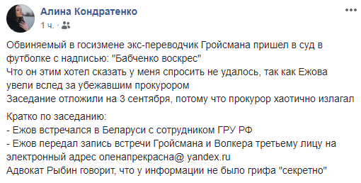 "Кратко по заседанию: Ежов встречался в Беларуси с сотрудником ГРУ РФ и передал запись встречи Гройсмана и Волкера третьему лицу на электронный адрес оленапрекрасна@yandex.ru. Адвокат Рыбин говорит, что у информации не было грифа "секретно".