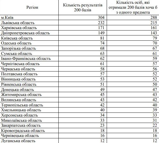 УЦОКО опубликовал список, областей, где набрали высшие баллы по предметам. Напомним, максимальный балл составляет 200. Больше всего таких результатов оказалось в Киеве (288 человек набрали высший балл хотя бы по одному предмету), далее идет Львовская область (215), а замыкает тройку Харьковская область (161). Всего 12 человек набрали 200 баллов хотя бы по одному предмету в Луганской области, она на последнем месте.