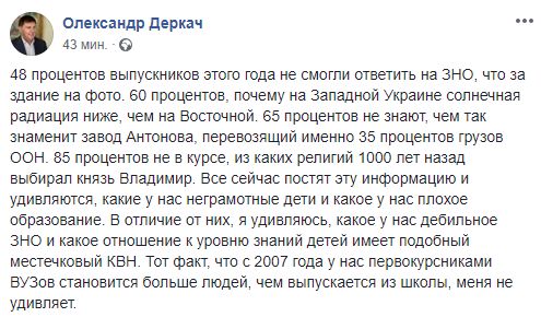 Предприниматель Александр Деркач считает, что в низких результатах виновата вся система ВНО: "Все сейчас постят эту информацию и удивляются, какие у нас неграмотные дети и какое у нас плохое образование. В отличие от них, я удивляюсь, какое у нас дебильное ЗНО и какое отношение к уровню знаний детей имеет подобный местечковый КВН. Тот факт, что с 2007 года у нас первокурсниками ВУЗов становится больше людей, чем выпускается из школы, меня не удивляет".
