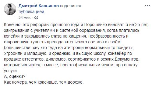 Блогер Дмитрий Касьянов: "Конечно, это реформы прошлого года и Порошенко виноват, а не 25 лет, заигрывания с учителями и системой образования, когда платились копейки и закрывались глаза на хищения, необразованность и откровенную тупость преподавательского состава в своем большинстве: "ну кто туда на эти гроши нормальный-то пойдет".