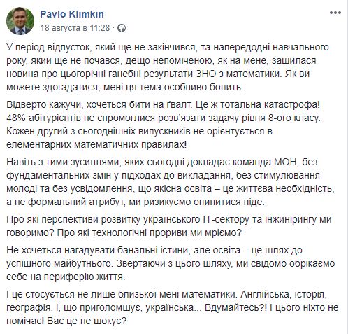 Министр иностранных дел Павел Климкин: "Откровенно говоря, хочется бить тревогу. Это же тотальная катастрофа! 48% абитуриентов не смогли решить задачу уровня восьмого класса. Каждый второй из сегодняшних выпускников не ориентируется в элементарных математических правилах!