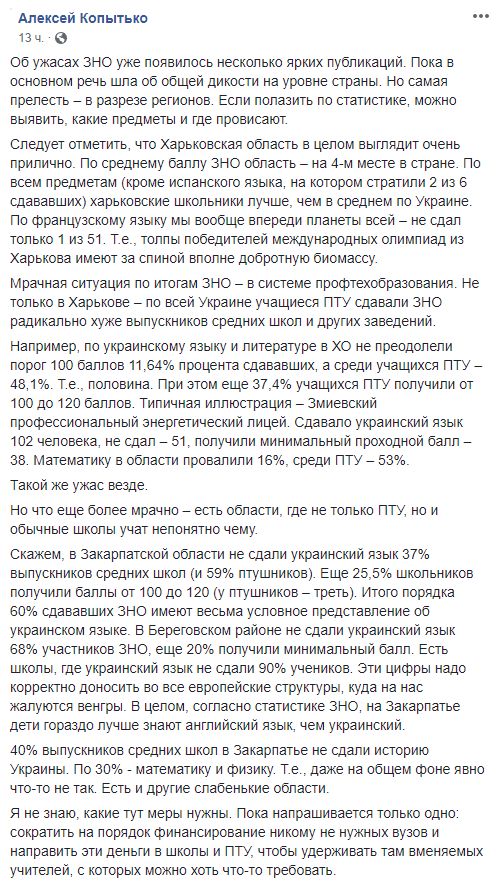 Такой же ужас везде. Но что еще более мрачно – есть области, где не только ПТУ, но и обычные школы учат непонятно чему. Скажем, в Закарпатской области не сдали украинский язык 37% выпускников средних школ (и 59% птушников). Еще 25,5% школьников получили баллы от 100 до 120 (у птушников – треть). Итого порядка 60% сдававших ЗНО имеют весьма условное представление об украинском языке. В Береговском районе не сдали украинский язык 68% участников ЗНО, еще 20% получили минимальный балл. Есть школы, где украинский язык не сдали 90% учеников. Эти цифры надо корректно доносить во все европейские структуры, куда на нас жалуются венгры. В целом, согласно статистике ЗНО, на Закарпатье дети гораздо лучше знают английский язык, чем украинский.