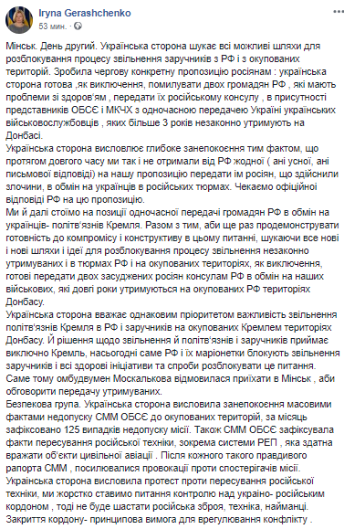"Украинская сторона ищет все возможные пути для разблокирования процесса освобождения заложников из РФ и с оккупированных территорий", - написала Геращенко в Facebook.