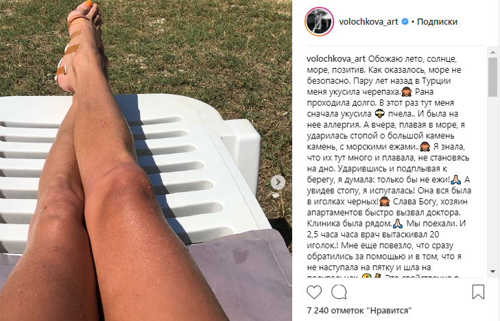 "Вчера, плавая в море, я ударилась стопой о большой камень, с морскими ежами", - рассказала она.
